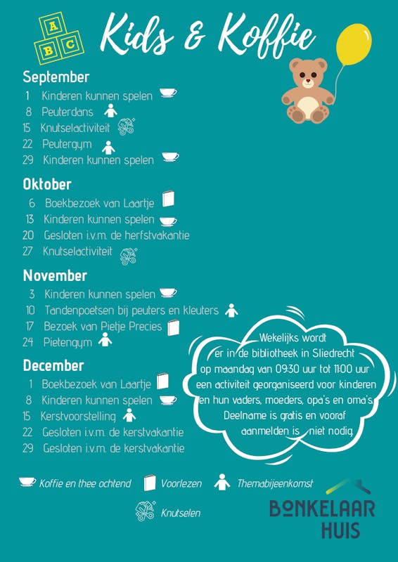 Wekelijks wordt er in de bibliotheek in Sliedrecht op maandag van 09:30 uur tot 11:00 uur een activiteit georganiseerd voor kinderen en hun vaders, moeders, opa's en oma's. Deelname is gratis en vooraf aanmelden is niet nodig.