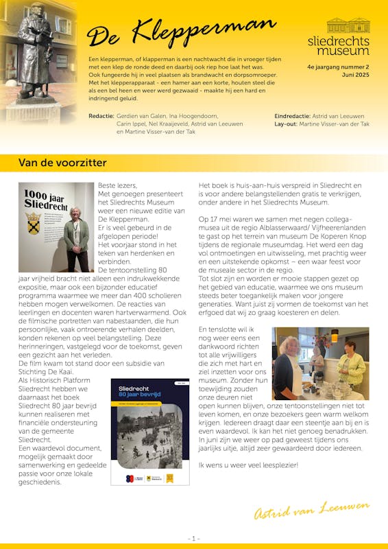 Vier keer per jaar verschijnt onze digitale nieuwsbrief ‘De Klepperman’. U vindt hier interessante artikelen en nieuws over het museum.