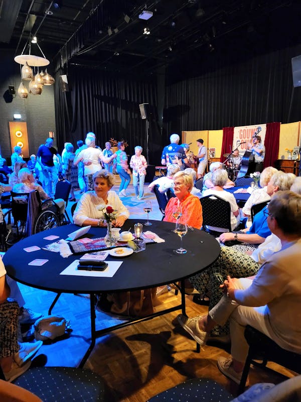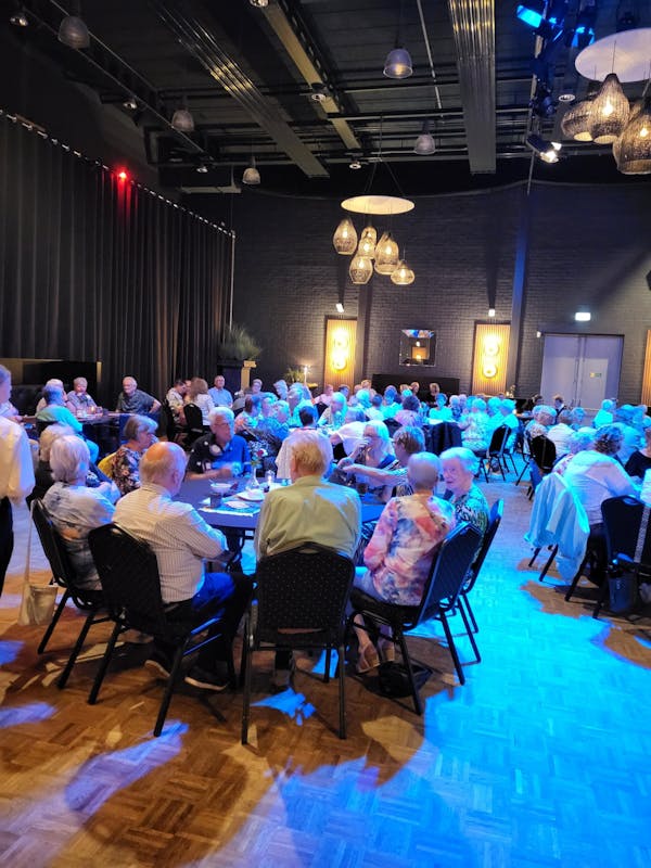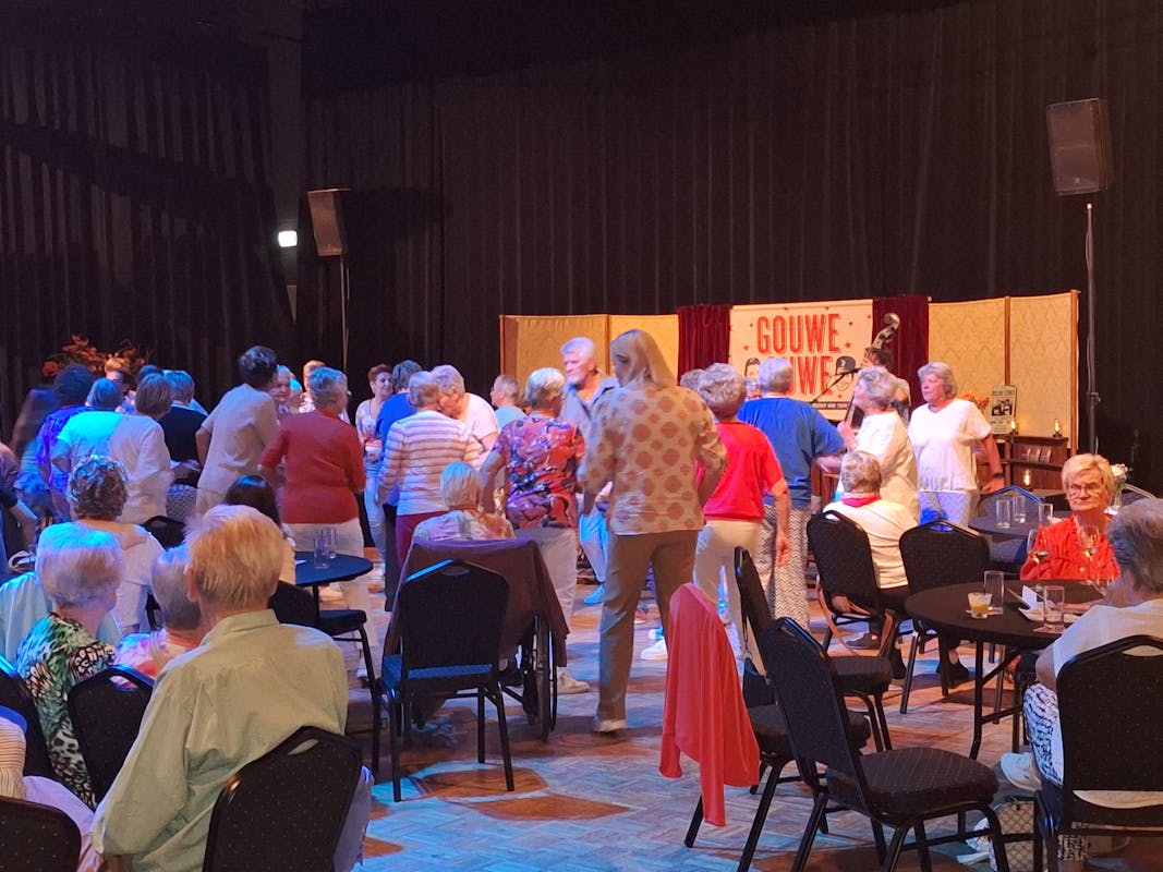 Rond 15.00 uur startte de “Gouwe Ouwe” band met bekende hits, en de dansvloer vulde zich snel. Iedereen genoot van de muziek, een drankje en de polonaise aan het einde zorgde voor een bruisende afsluiting van de middag.