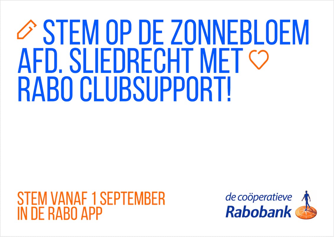 Wij vragen uw aandacht voor de actie RABO Clubsupport - die de lokale verenigingen en stichtingen financieel ondersteunt. Leden van de RABO mogen stemmen - kijk op uw app. (meestal onderaan ''Mijn lidmaatschap'', waar u kunt stemmen.